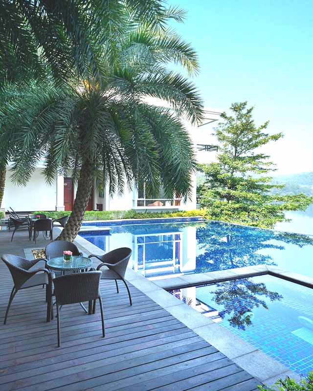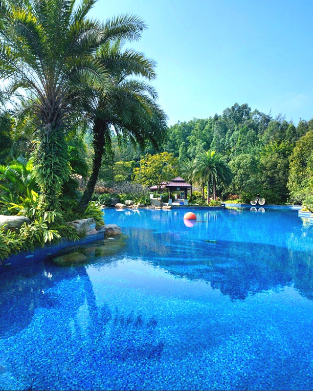 散布在山畔的马来西亚风别墅,椰林绿植,园林小院,散发着浓浓的异域风情。躺在别墅前的泳池平台上,听着潺潺的流水,感受鸟语花香的原始气息,远处就是包围着酒店的近40万平方米的大钟湖,超大的无边际好像和自然湖泊连成一片,感觉整个山的全部水系都在怀中,让人彻底放松沉醉了。
