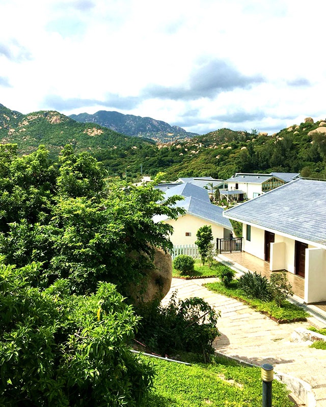 远远地看见酒店,浓浓热带海洋风情的小楼房点缀在海湾和山石之间,感觉就像一个隐藏在山海之间的小小村庄,遗世而宁静。远处是浩瀚的海湾和天水相接的大海,倚靠着山峦奇石,山顶巨大的风动石好像在跟着海风慢慢晃动,一派只属于海滨小渔村的浪漫祥和,让人一眼就爱上了这地方。